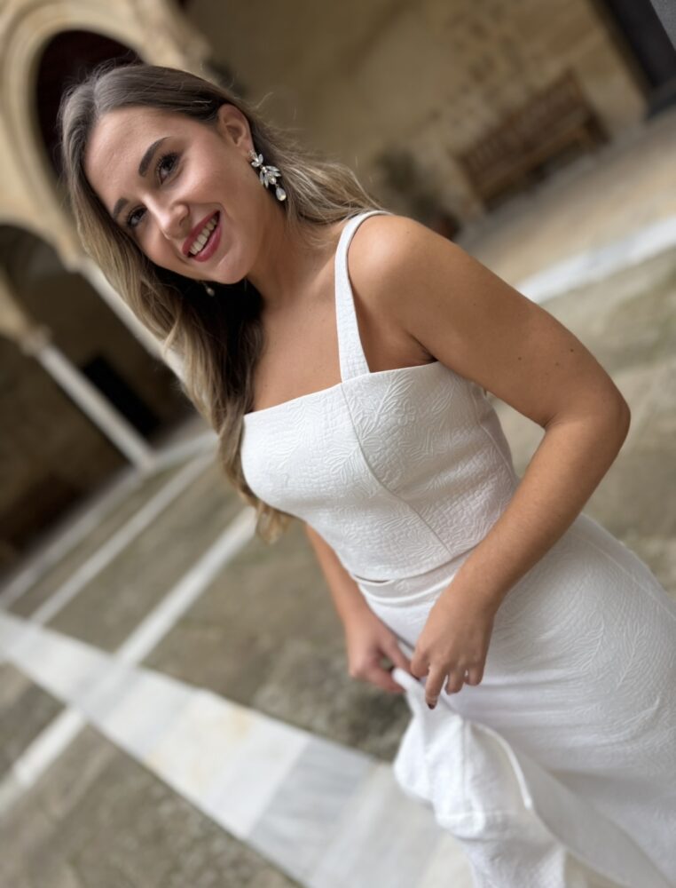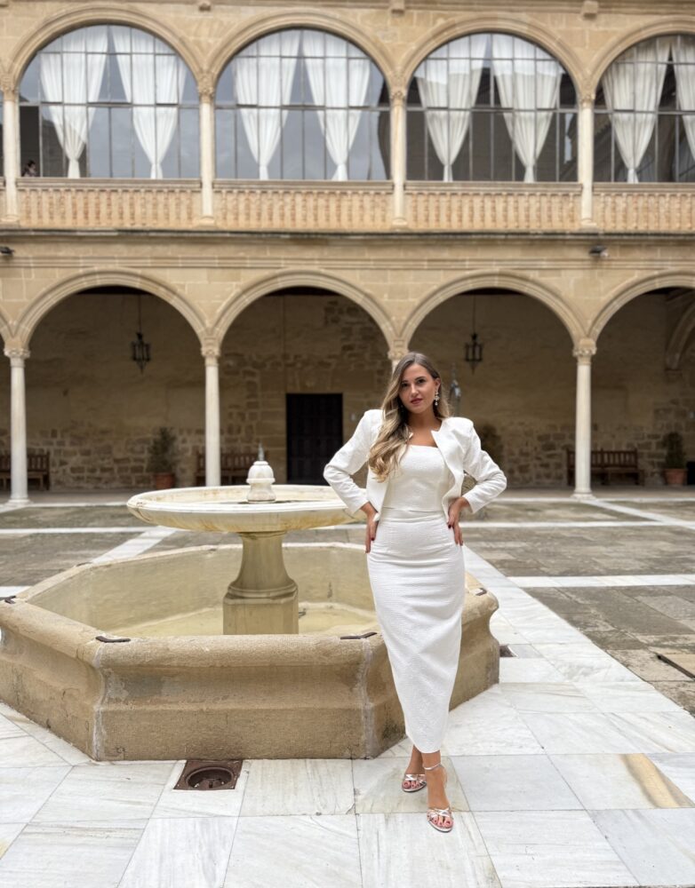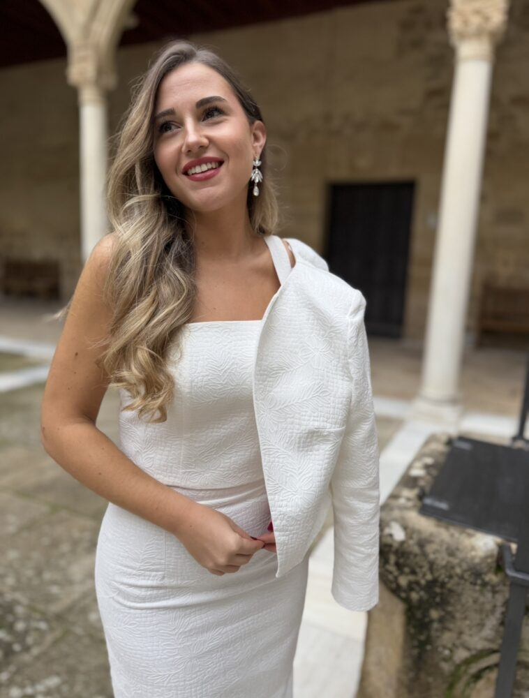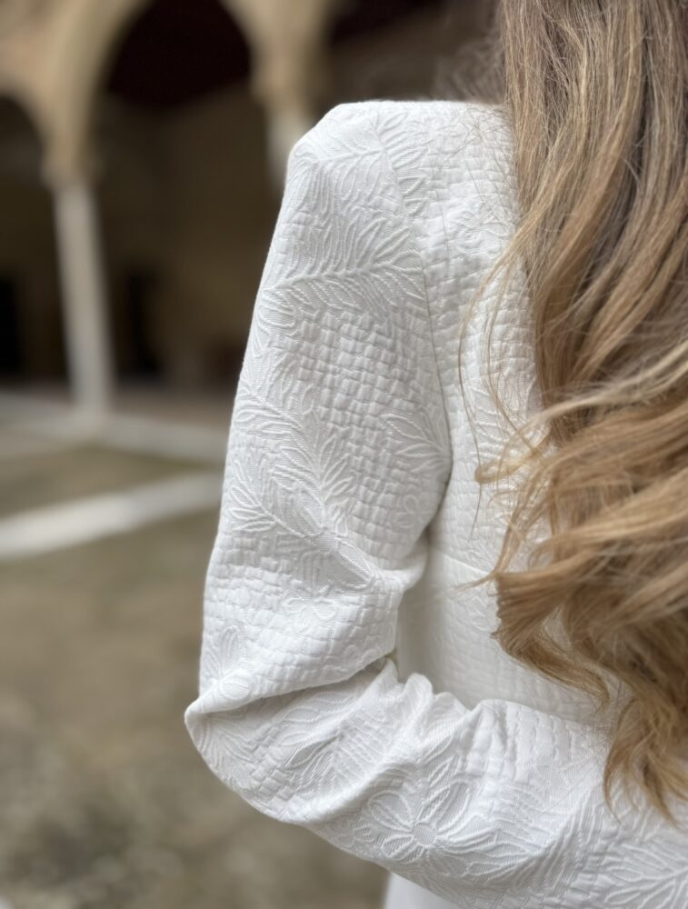 Conjunto de tres piezas compuesto por falda, top de tirantes y chaqueta en tejido algodón texturizado forrado al tono. El toque de distinción lo marca la originalidad del diseño. El top lleva la espalda totalmente abotonada con botones forrados al tono. La falda es de tiro alto con raja trasera pronunciada.