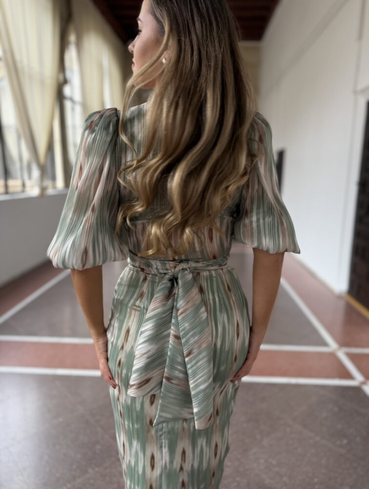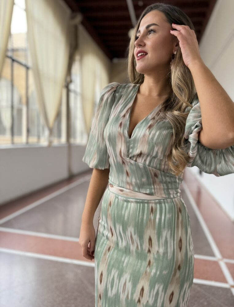 Conjunto de blusa y falda en tejido gasa de color verde menta forrado al tono. El toque de distinción lo marca el escote pico, la manga abullonada y la lazada del top en la parte trasera o frontal al gusto. La falda es de tiro alto con raja trasera.