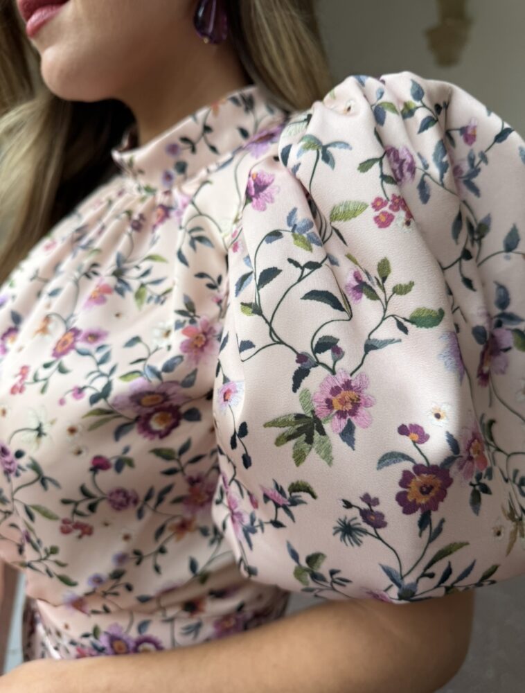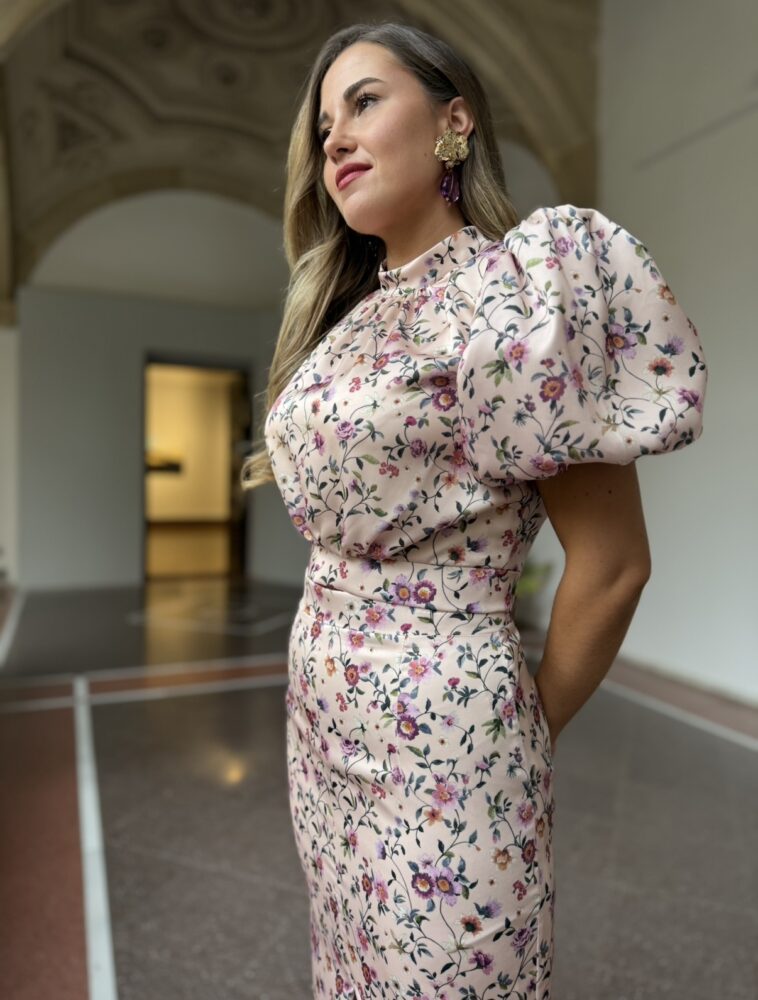 Conjunto de falda y blusa de tejido satén estampado forrado al tono. El toque de distinción lo marca la manga abullonada y el escote cerrado de la blusa. La falda de tiro alto y con la raja frontal. Un conjunto ideal para arrasar como invitada perfecta en cualquier evento.