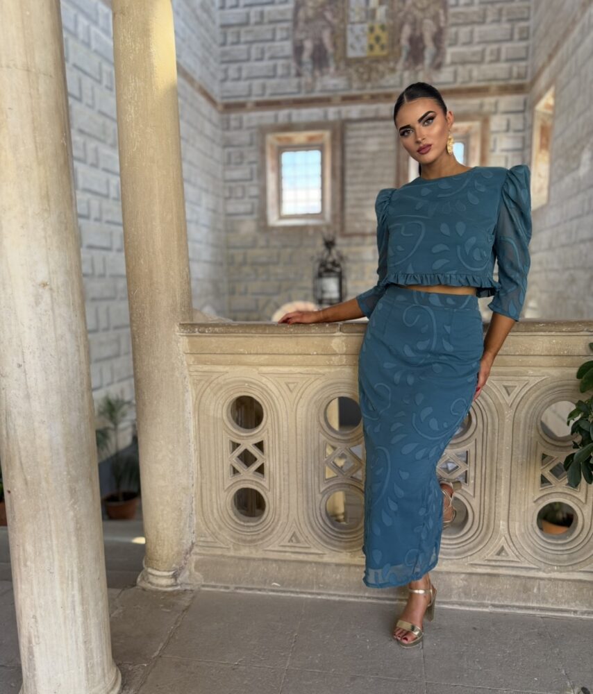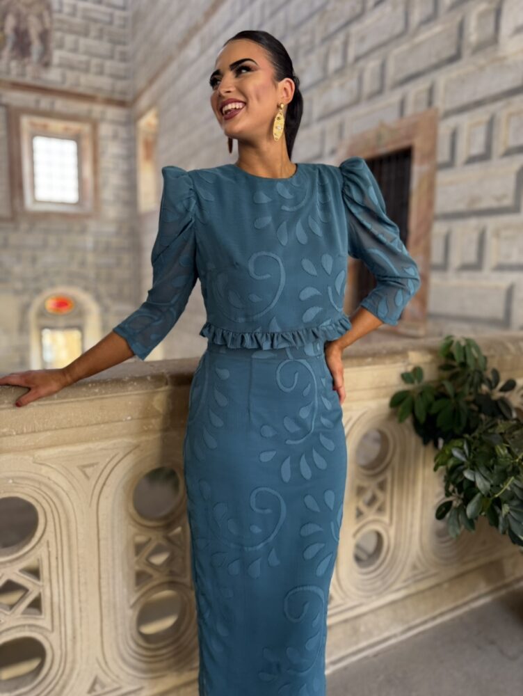 Conjunto de dos piezas formado por falda y blusa en tejido gasa texturizado forrado al tono. El toque de distinción lo marca la botonadura trasera, el peplum en blusa y la falda tipo lápiz con raja trasera.