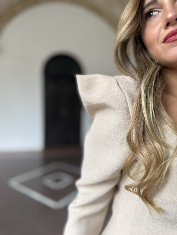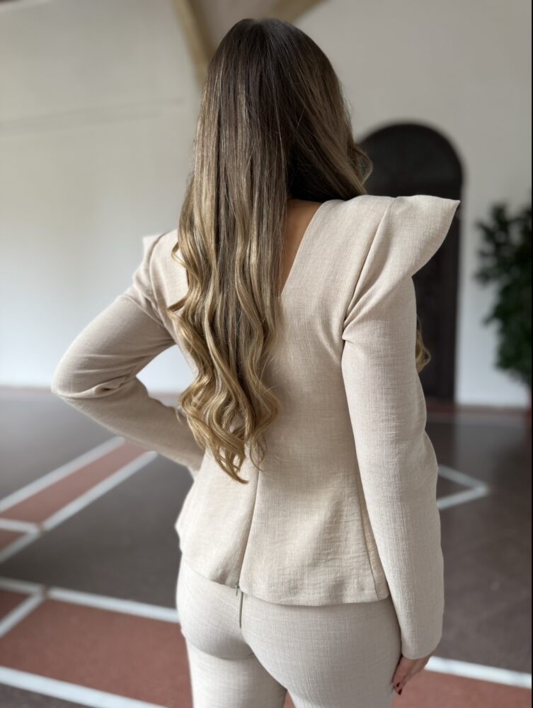 Traje compuesto por pantalón y chaqueta en tejido lino sintético de color camel. El toque de distinción lo marca la americana con la hombrera marcada y los botones frontales dorados. El pantalón es de campana con cintura alta.