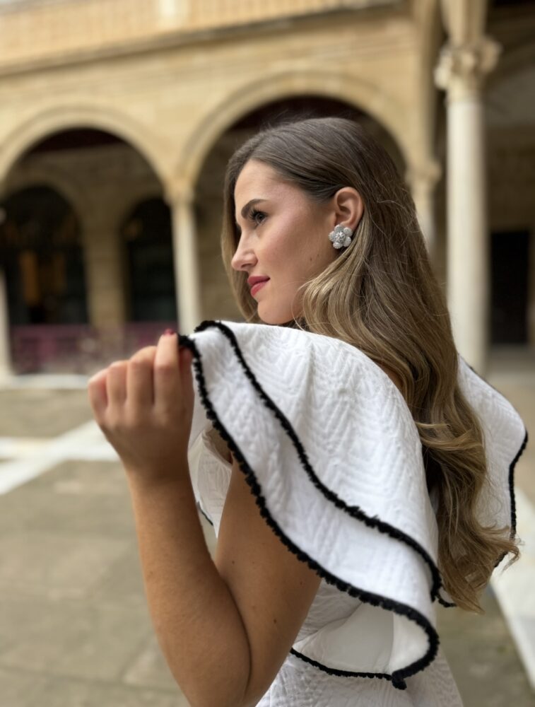 Vestido midi de color blanco en tejido algodón texturizado forrado al tono. El toque de distinción lo marcan los volantes de la parte frontal y trasera con los ribetes en negro. El escote pico y la raja trasera marcan los detalles de un vestido espectacular para una madre de comunión, bautizo o novia civil.