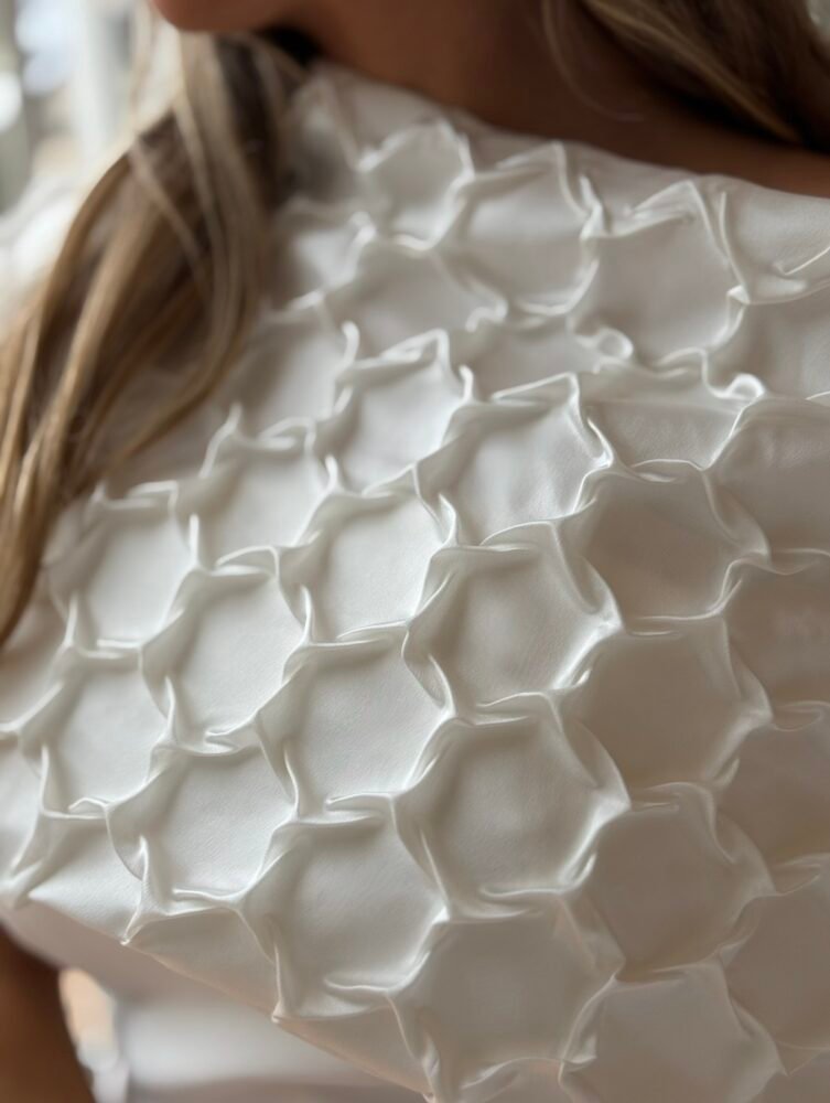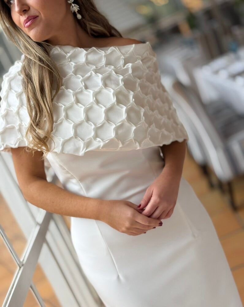 Vestido midi en tejido crepe de color blanco forrado al tono. El toque de distinción lo marca la capa en nido de abeja q se puede poner y quitar. Es un vestido de palabra de honor en color blanco ideal para brillar como novia civil, madre de comunión o bautizo.