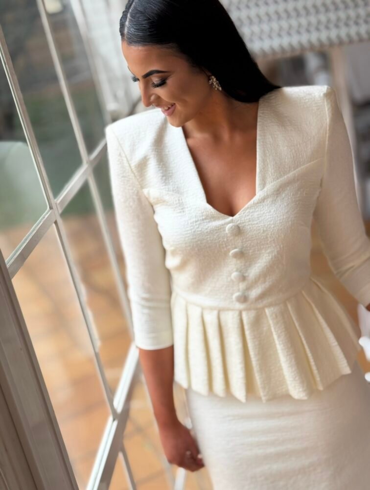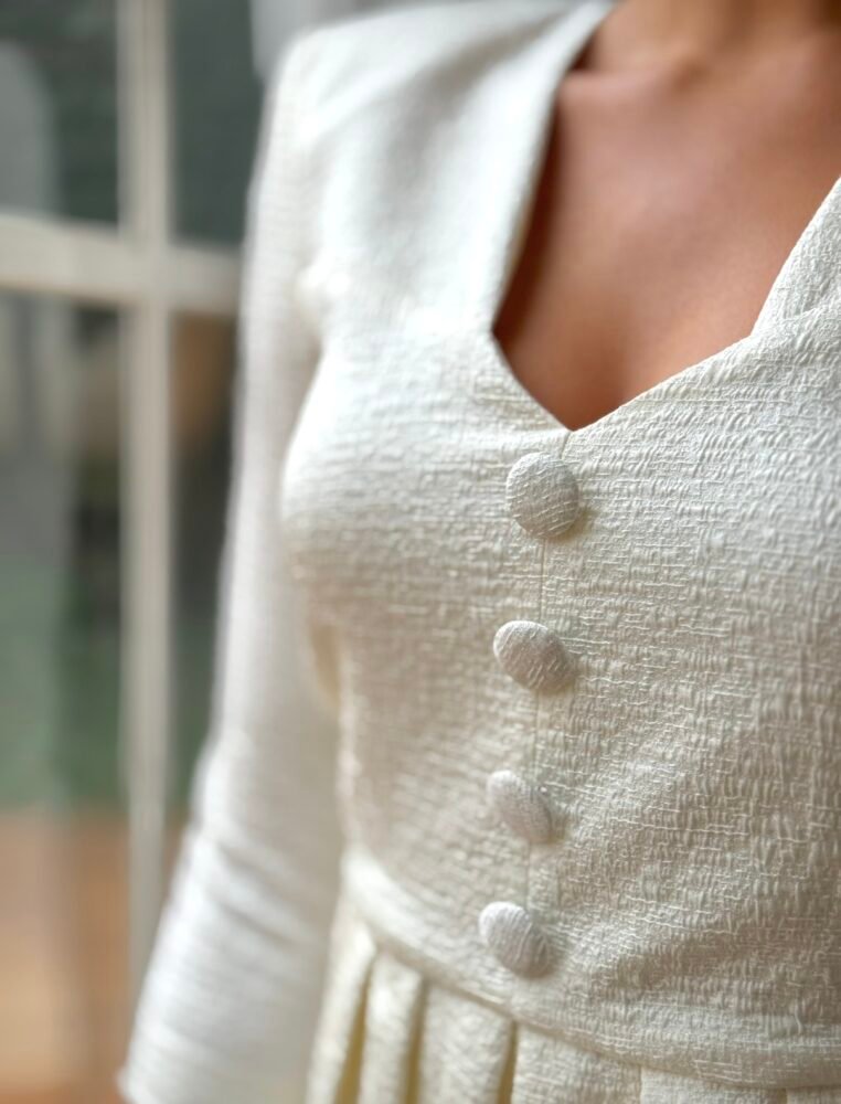 Vestido midi de tejido texturizado de color crema forrado al tono. El toque de distinción lo marca el “peplum” en cintura, los botones frontales forrados al tono y la trasera marcada.