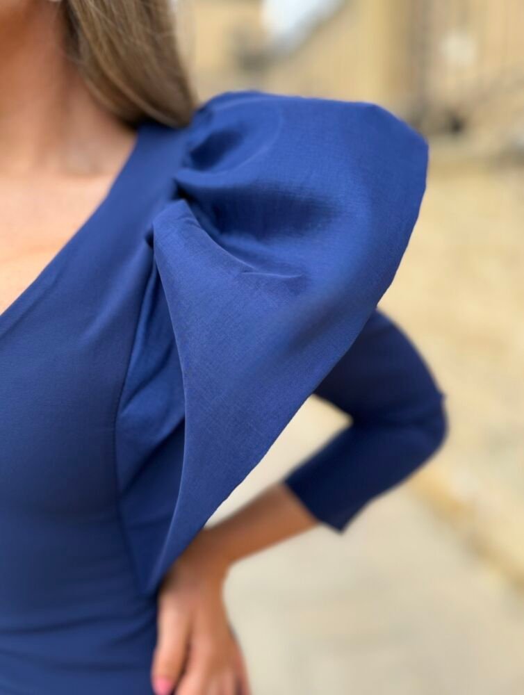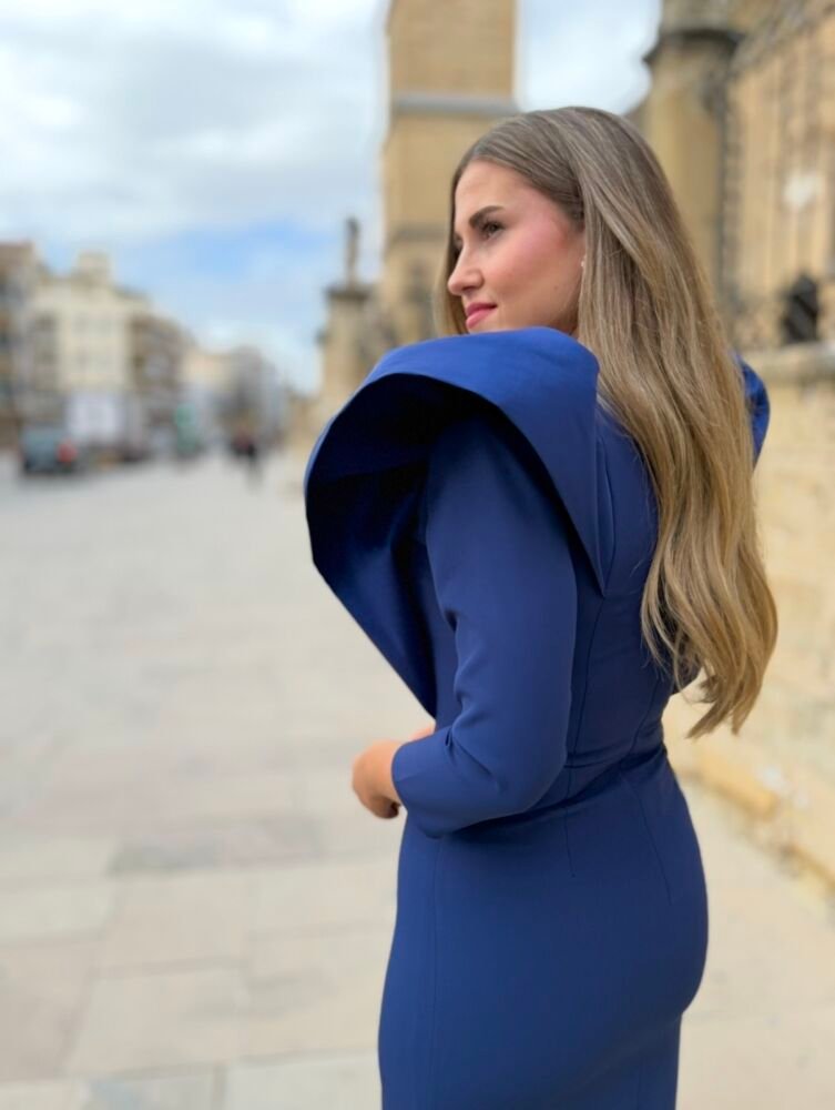 Vestido midi en tejido crepe forrado al tono de color azul marino. El toque de distinción lo marca las volumetrÃas en tafetán de la parte frontal, el escote pico y la espalda totalmente cerrada con cremallera invisible a diferencia de los anteriores modelos que si tenÃan la espalda abierta.