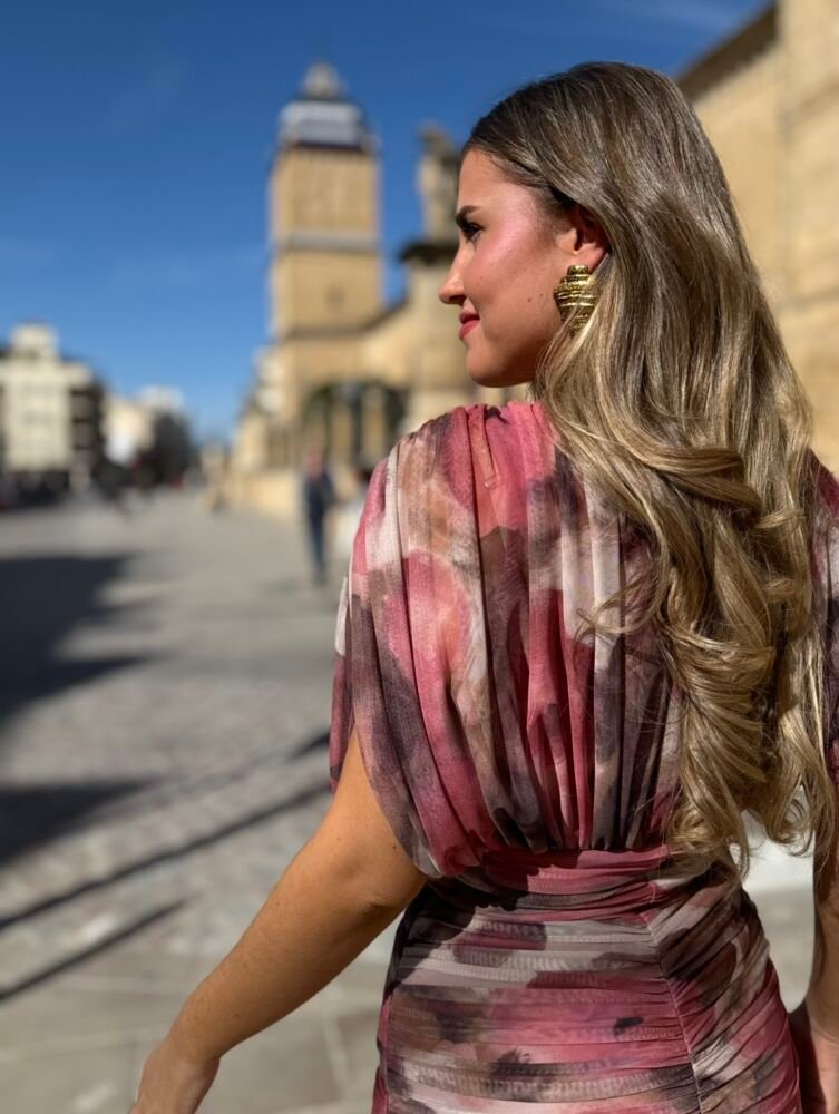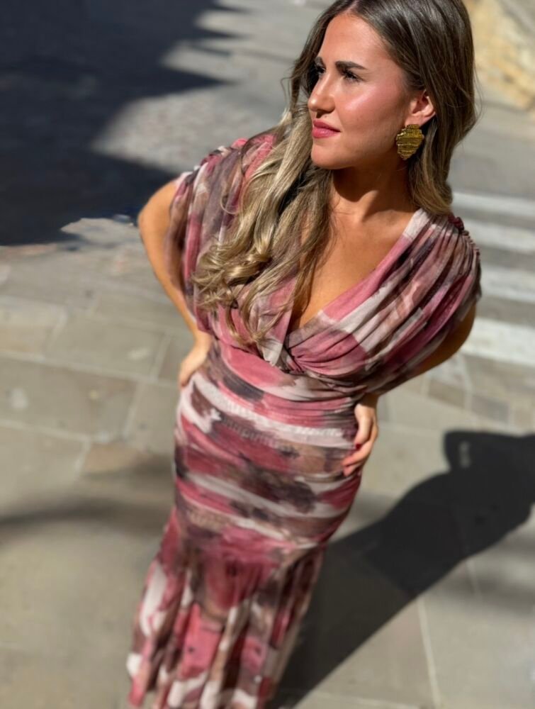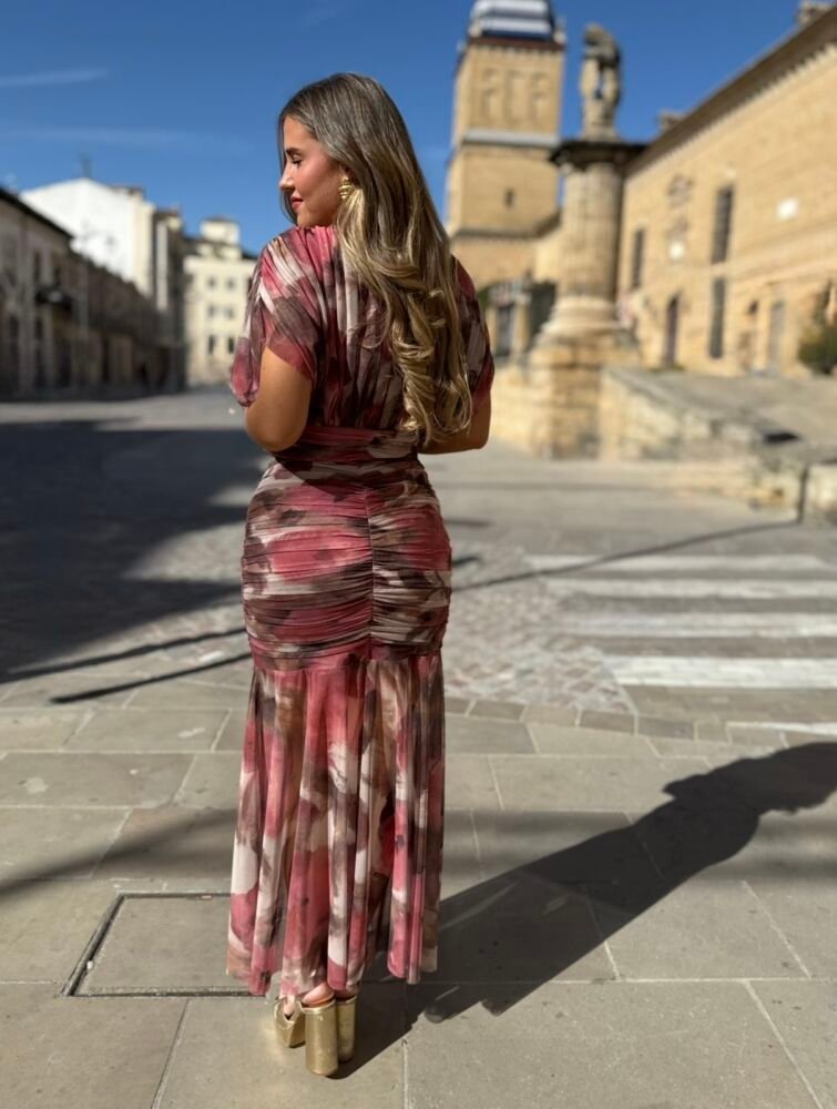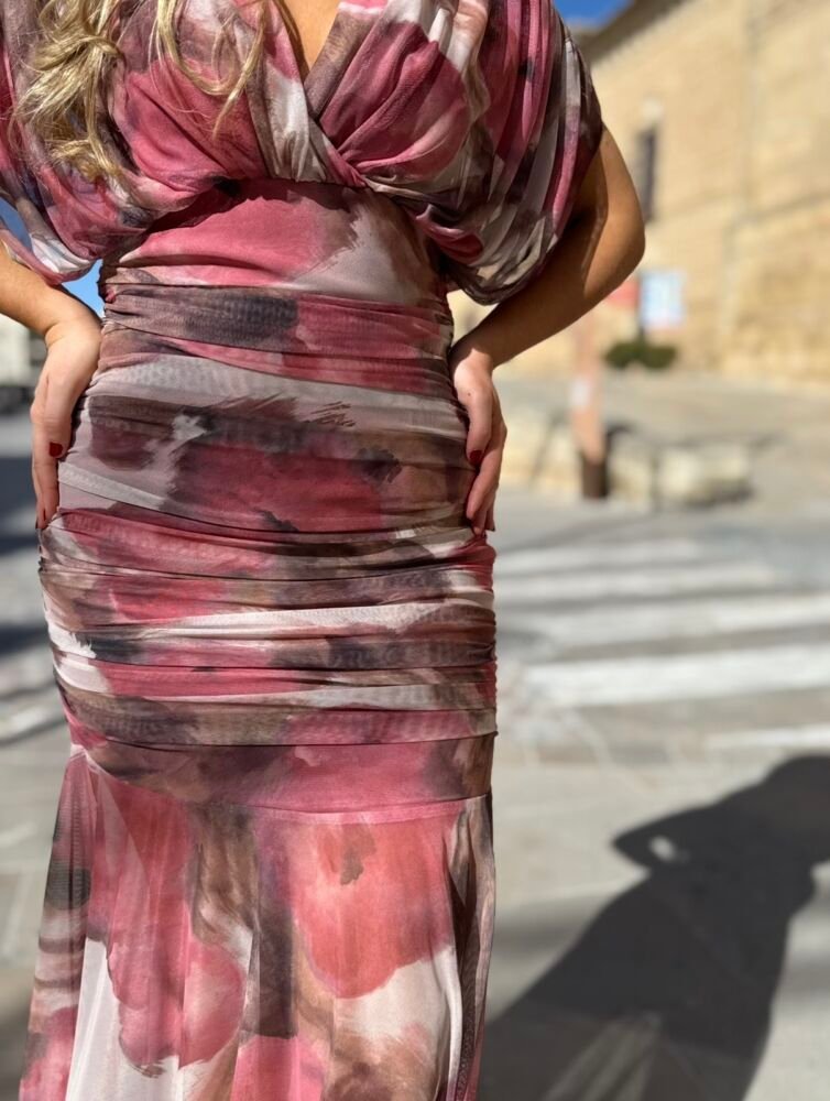 Vestido midi en tejido tul estampado elástico forrado al tono. El toque de distinción lo marca los drapeados del cuerpo, el escote pico y la falda con vuelo en su terminación. Un vestido con un diseño super original y sofisticado para brillar en tu evento.