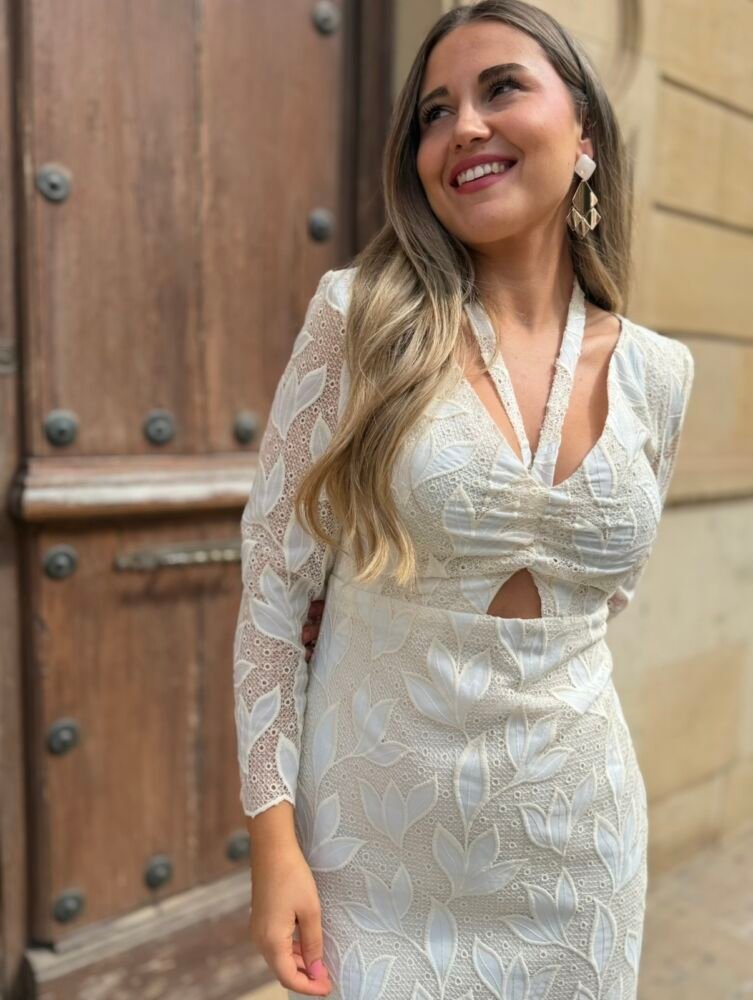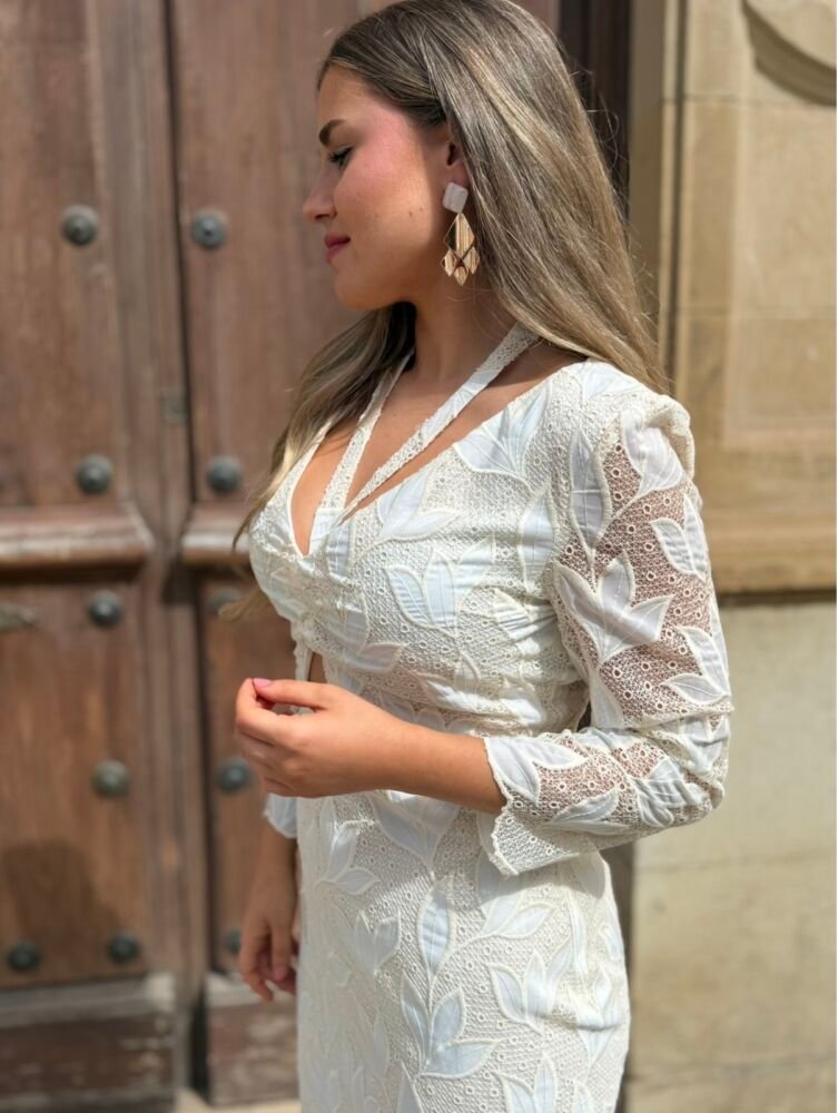Vestido midi en tejido guipur perforado forrado al tono de color crema. El toque de distinción lo marca el escote pico, el “cut” en cintura y la raja trasera pronunciada. Un vestido espectacular para arrasar como madre de comunión, bautizo o novia civil.