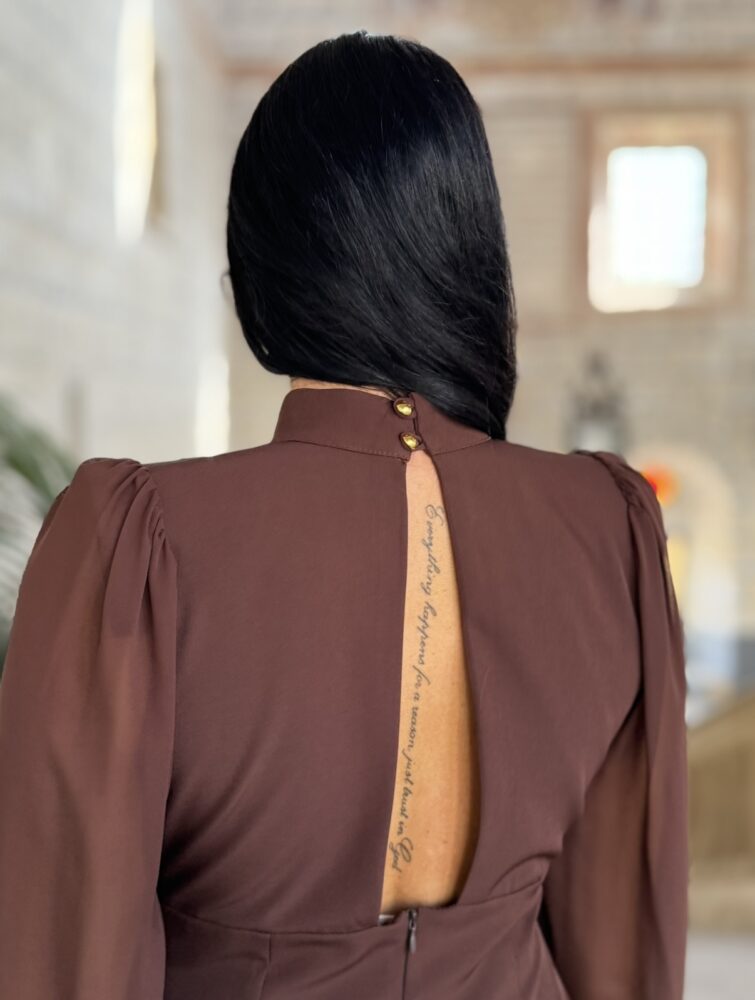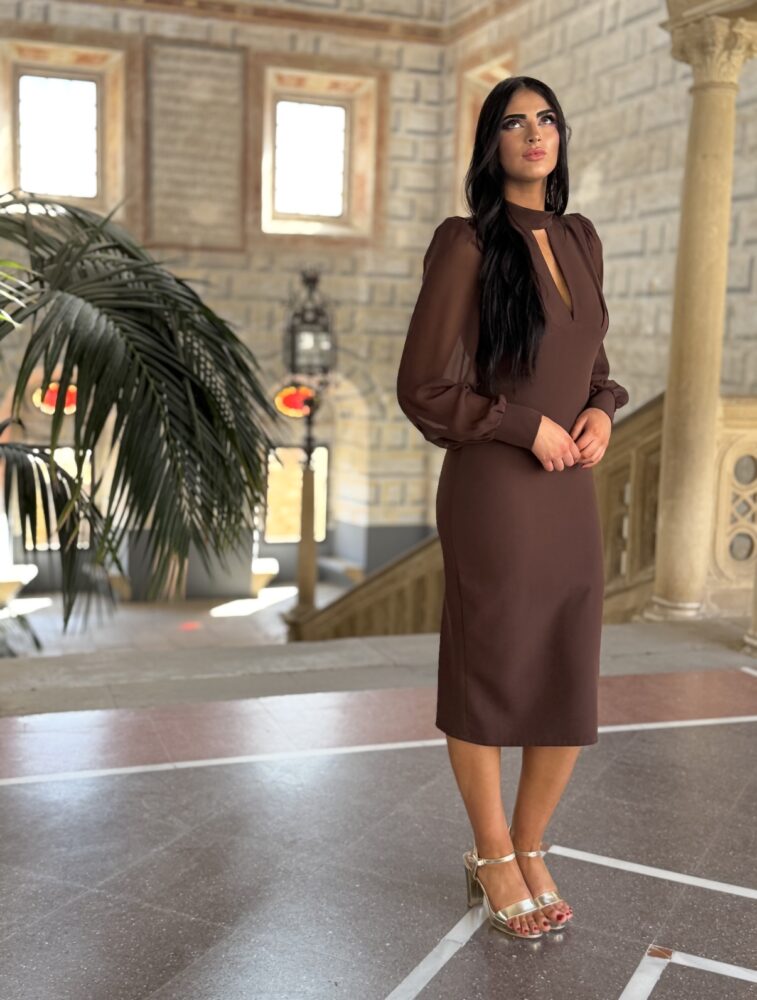Vestido midi en tejido crepe de color marrón forrado al tono. El toque de distinción lo marca el “cut” en pecho y el diseño tan elegante que tiene. Lleva una raja trasera que deja ver la espalda.