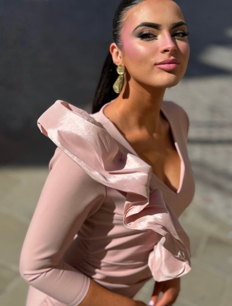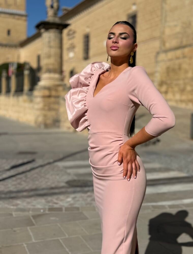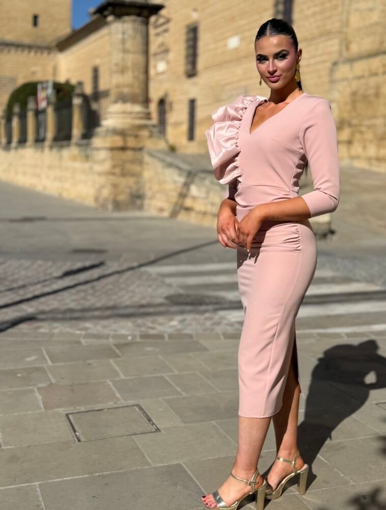 Vestido midi en tejido crepe de color rosa forrado al tono. El toque de distinción lo marca el volante de la zona superior en tejido tafetán, el escote pico y la raja trasera marcada.