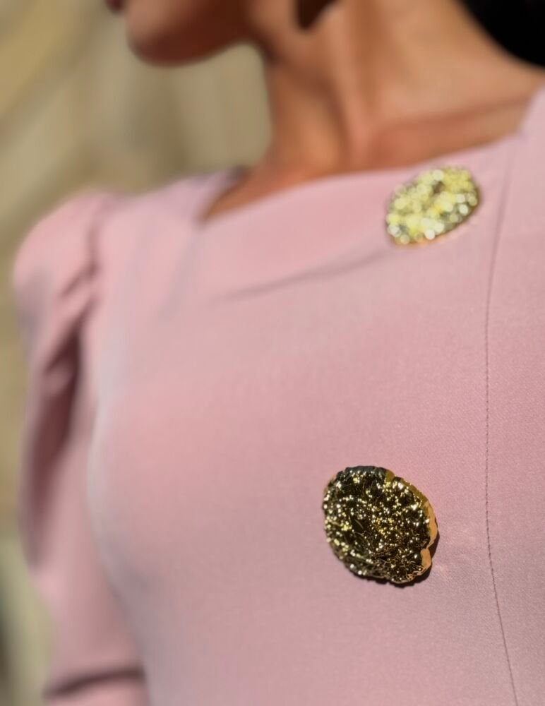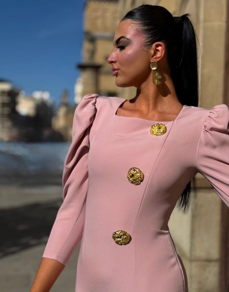 Vestido midi en tejido crepe de color rosa forrado al tono. El toque de distinción lo marca las hombreras marcadas, los botones vintage y la raja frontal lateralizada. Un vestido muy elegante para arrasar como invitada perfecta.