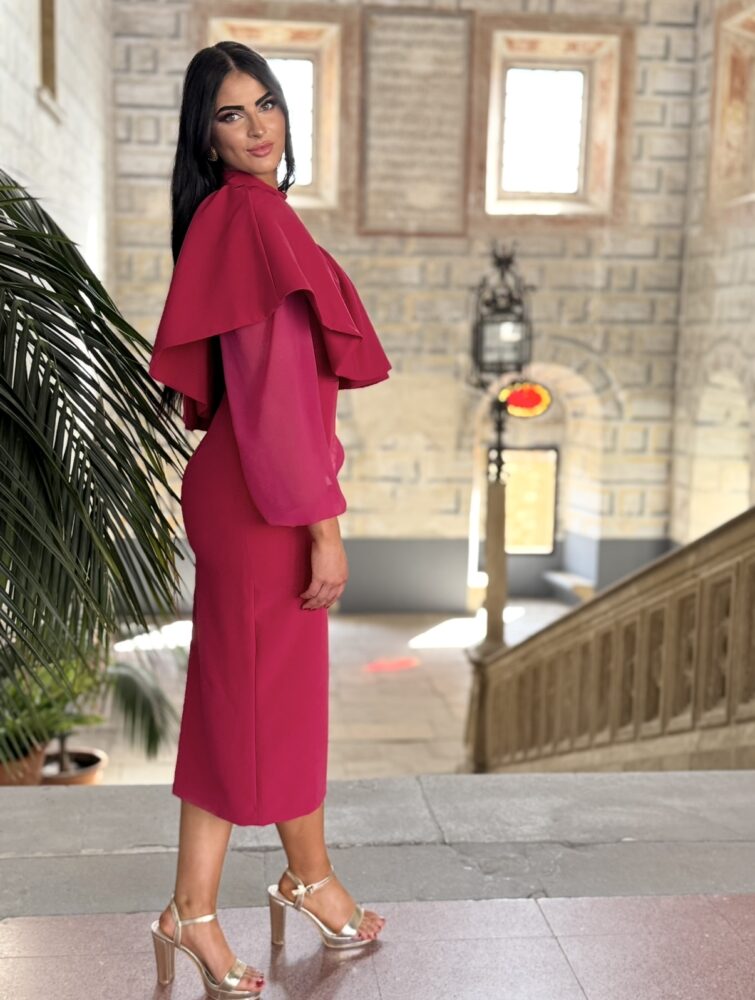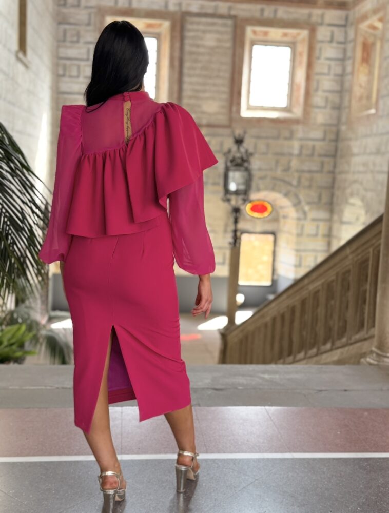 Vestido midi en tejido crepe de color rosa forrado al tono. El toque de distinción lo marca el volantón de toda la zona superior, la asimetrÃa de la manga y la combinación de tejidos (gasa y crepe).