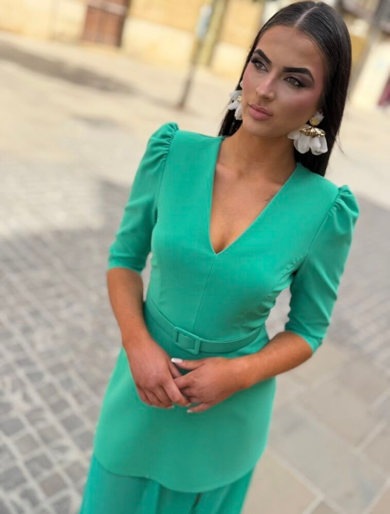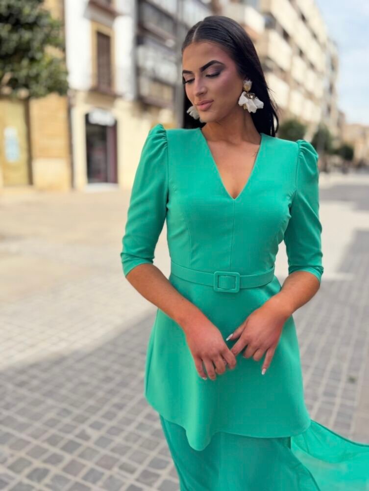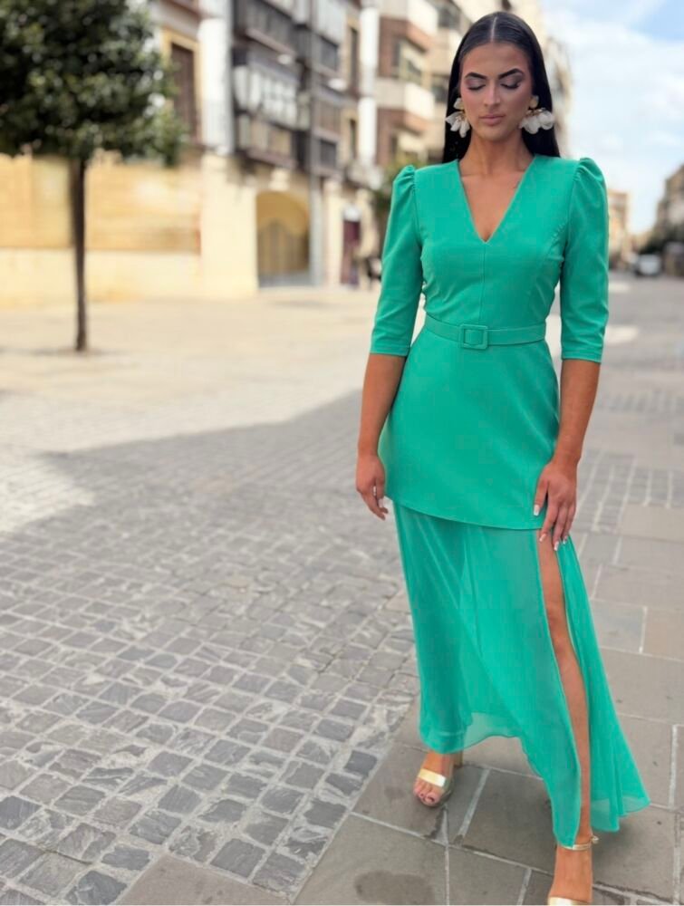 Vestido largo de color verde en tejido crepe forrado al tono. El toque de distinción lo marca la originalidad del diseño. Lleva un vestido de crepe con terminación en gasa con un cinturón al juego para marcar la silueta. Un vestido espectacular para arrasar como invitada perfecta.