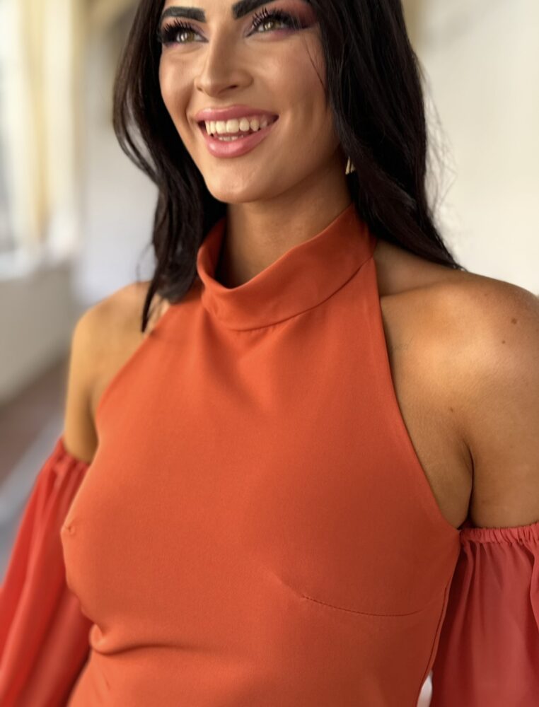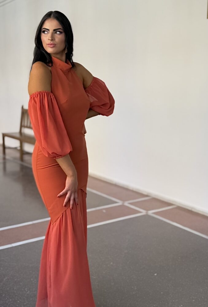 Vestido largo en tejido crepe con gasa forrado al tono. El toque de distinción lo marca el cuello halter, los manguitos en los brazos y la combinación de tejidos tan original en la falda.