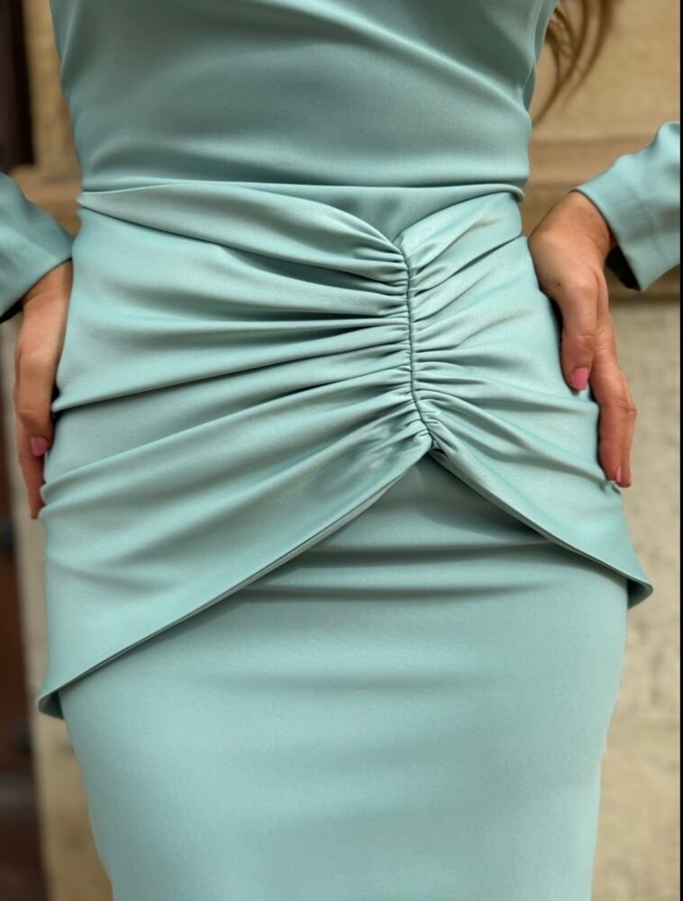 Vestido midi en tejido crepe de color verde menta forrado al tono. El toque de distinción lo marca la asimetrÃa de la manga, el drapeado en gasa de la zona frontal y la raja trasera. Un vestido muy femenino para arrasar como invitada perfecta.