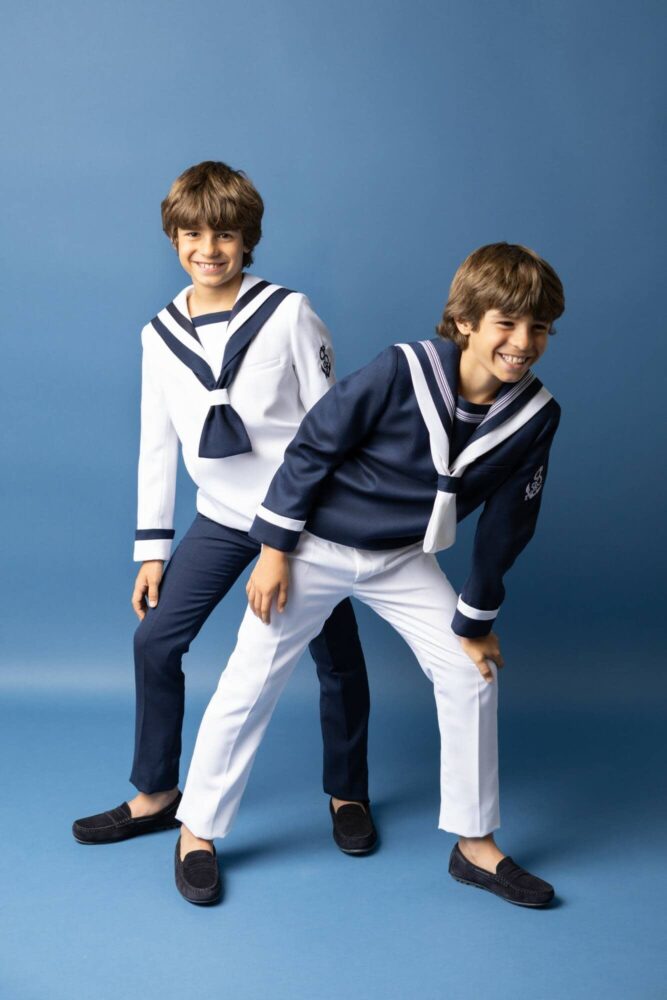 Traje de comunión tipo marinero. Consta de pantalón en blanco y casaca en azul marino con corbatÃn y detalles en blanco.