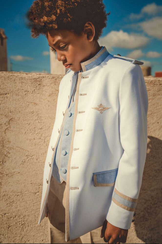Traje de admirante con doble botonadura de color verde menta, crema y blanco. Va compuesto de pantalón, camisa de lino y americana