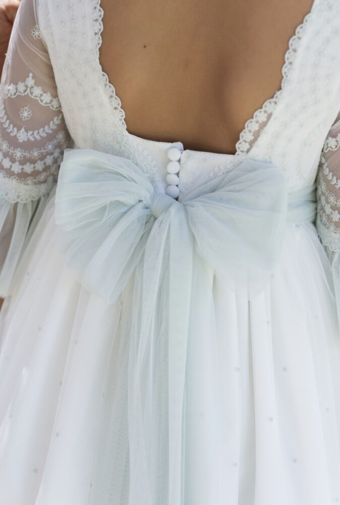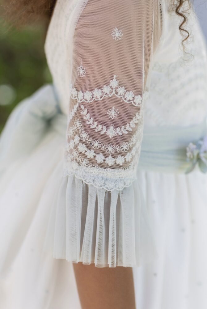 La manga es francesa de tul transparente totalmente bordada. La cintura lleva una lazada en verde pastel con doble tul.