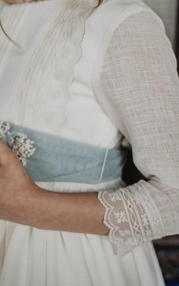 Tiene una manga francesa con terminación en puntilla y cinturón de doble tul azul.