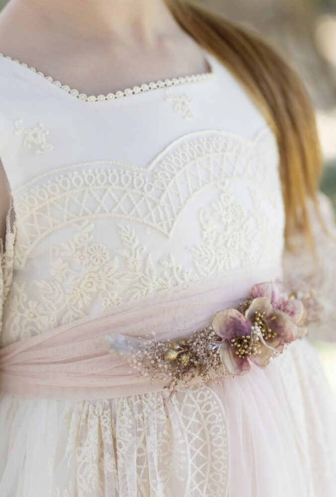 Vestido de comunión fabricado en tul marfil y detalles en tul rosa. Su cuerpo bordado destaca por una espalda en pico aportando un toque sofisticado. Un cinturón de doble tul rosa con un hermoso adorno de flores realza la cintura.