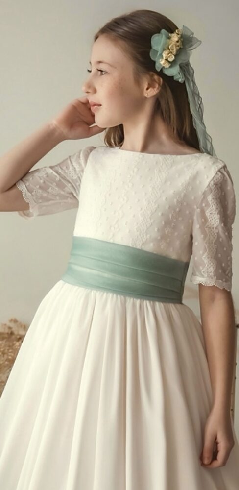 Vestido de comunión en organza de seda de color blanco natural. El cuerpo está totalmente bordado sobre plumeti. La manga es sencilla a juego con la parte superior.
